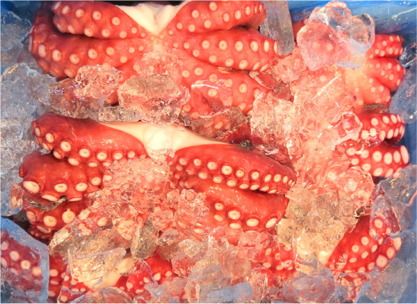 トラックなどで、全国各地から運ばれてきた水産物は、新鮮で安全にお届けするために卸売場に並べられます。 -